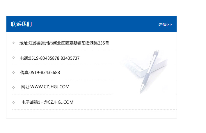 地址:常州市新北區友邦商務大廈1幢16、17層  電話:0519-85101652  傳真:0519-85112595  郵編:213022  網址:www.cz-jiayue_cn.pushi56.com  郵箱:xiajifengaa@163.com